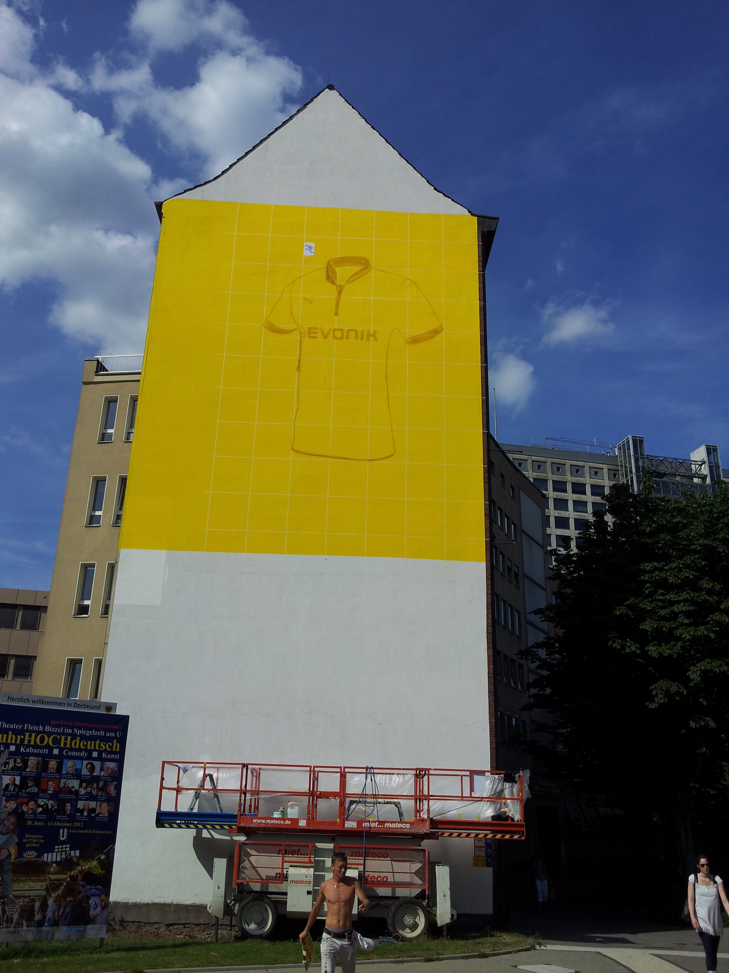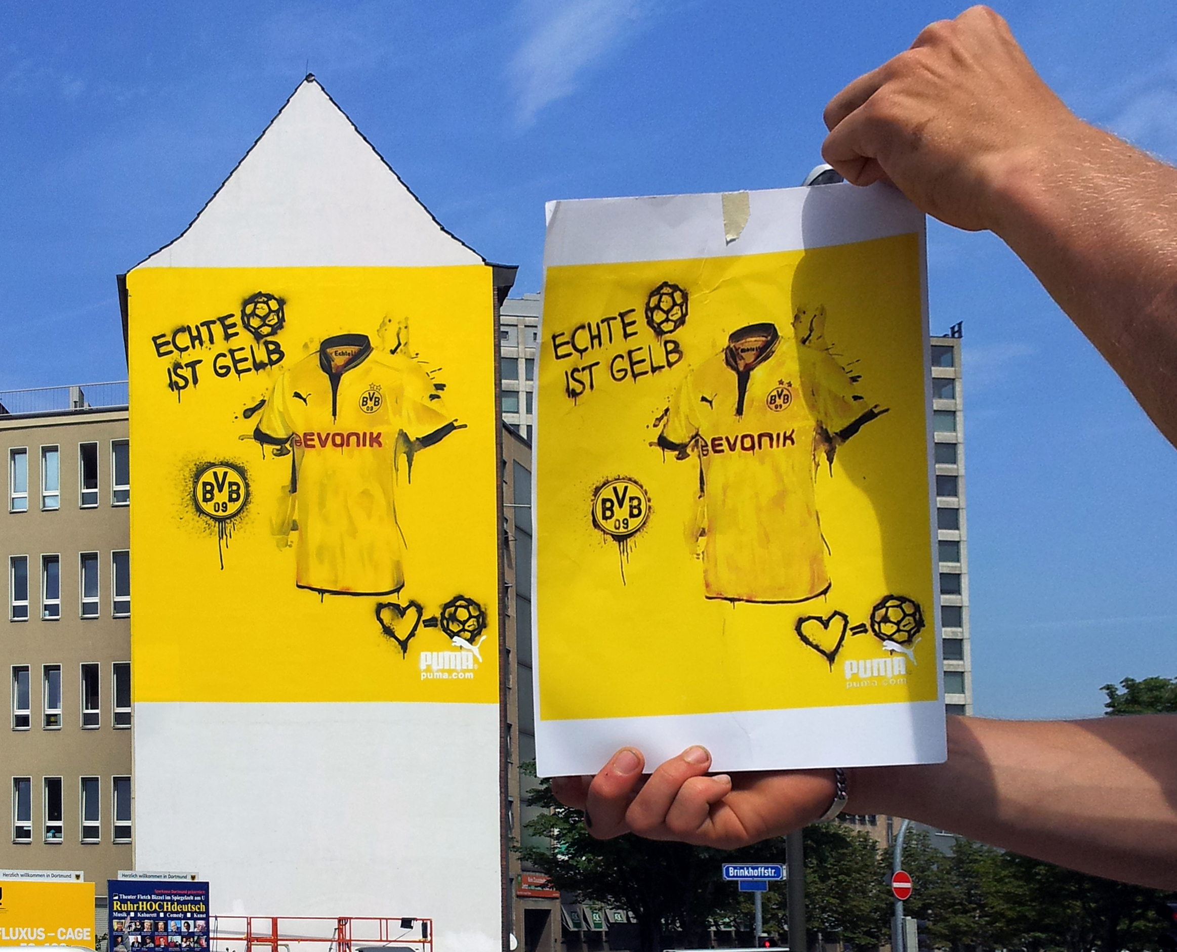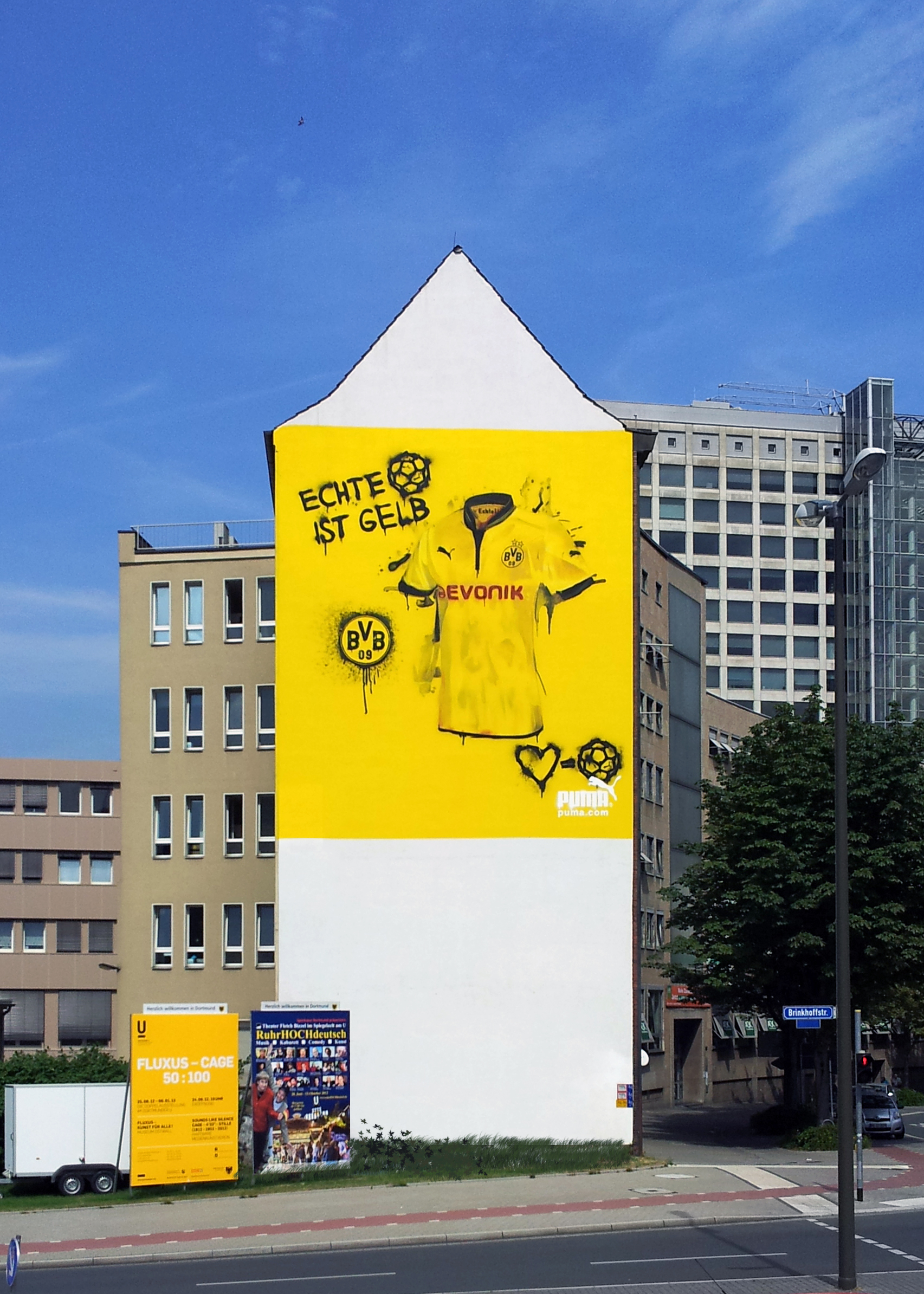 Eine weitere verblüffende Fassadengestaltung wurde für die Puma Street Art Kampagne 2012 von smart art entworfen. Hier wurde ein überdimensionales Trikot des BVBs mit Airbrushtechnik an eine Häuserfassade gebracht. Die borussengelbe Hintergrundfarbe springt schon von weitem ins Auge; ein echter Hingucker mit perfektem Werbeeffekt.
